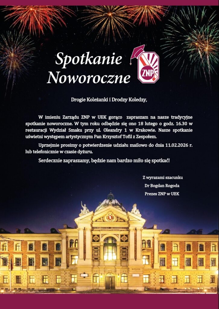 Drogie Koleżanki i Drodzy Koledzy, Zarząd ZNP w UEK serdecznie zaprasza na nasze tradycyjne spotkanie noworoczne. W tym roku odbędzie się ono 18 lutego o godz. 16.30 w restauracji Wydział Smaku przy ul. Oleandry 1 w Krakowie.